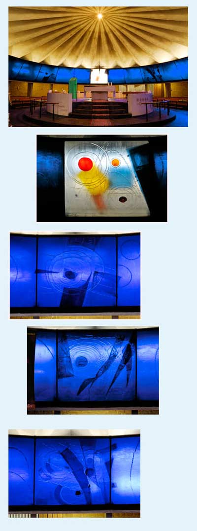 Ce vitrail a une double destination : évoquer la vie du Christ et la Jérusalem Céleste («Ciel»). Dans sa partie nord, en regardant de l’ouest à l’est, on voit la suite des gravures stylisées évoquant la vie terrestre du Christ : La moitié sud du vitrail exprime la présence invisible du Christ dans la vie de l’Eglise. Le vitrail central est le plus important par sa position face à l’entrée, par son orientation est-sud-est en direction de la Terre Sainte, mais surtout par sa signification : la Résurrection (triomphe du Christ).